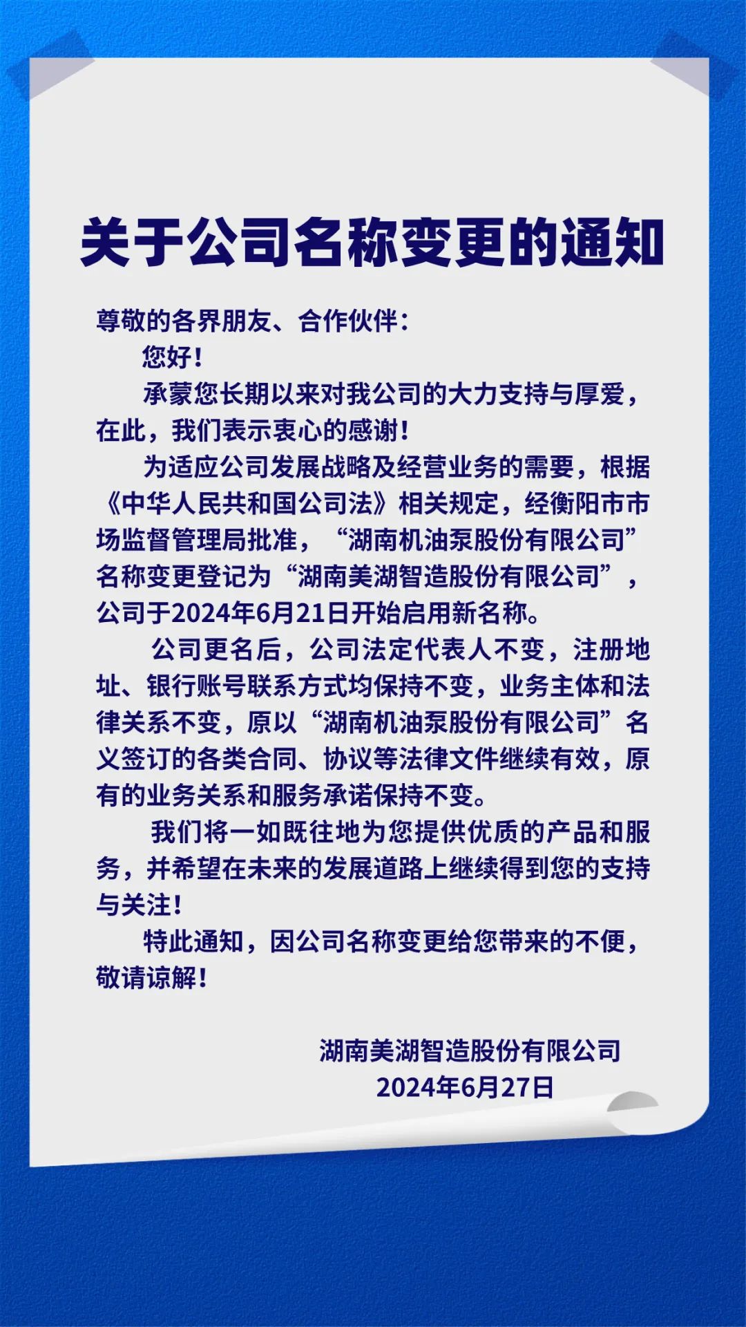 湖南機油泵股份有限公司變更為湖南美湖智造股份有限公司的通知
